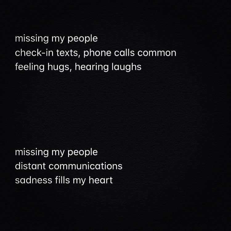 miss/ing my peo/ple // check/in texts, phone calls com/mon // feel/ing hugs, hear/ing laughs