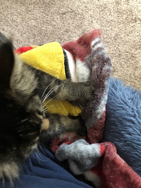 I hung out with you that next day in the bedroom, just to keep you company, so happy that you were back with us, but we didn’t keep you separated for long. It was shorter than either of us expected: Alphonse was trying to play with you through the glass, we opened the door maybe a week later to test the waters, but he instantly changed his mind. It was soon after that that we were able to open the door again and all three of you were able to live amongst each other.