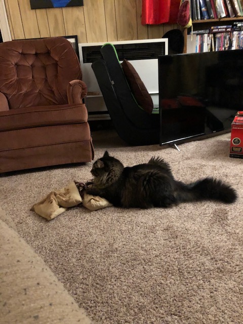 Your patience with Azzie and Sawyer stayed. You loved when our landlord friend and his brother were working on The Hobbit Hole; you’d sit there and watch them for hours. You were a lot people’s favorite cat of the three for this reason. Also, your ridiculously fluffy tail.