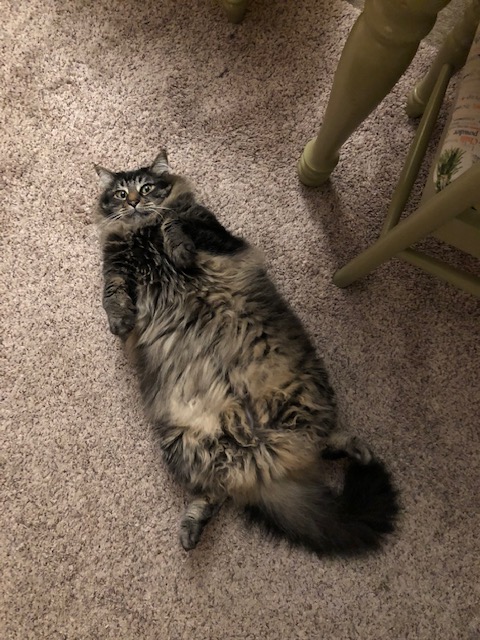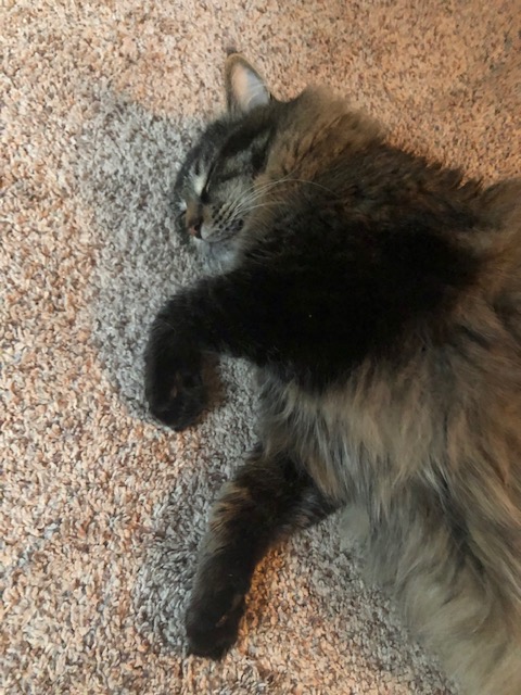 That was new. When you lived with Mom and Dad, you were comfortable with Dad holding you in his arms on your back. You didn’t keep that trait, but your default relaxing position on the floor was to lay on your back. We think you learned it from Buster, Mom and Dad’s dog.